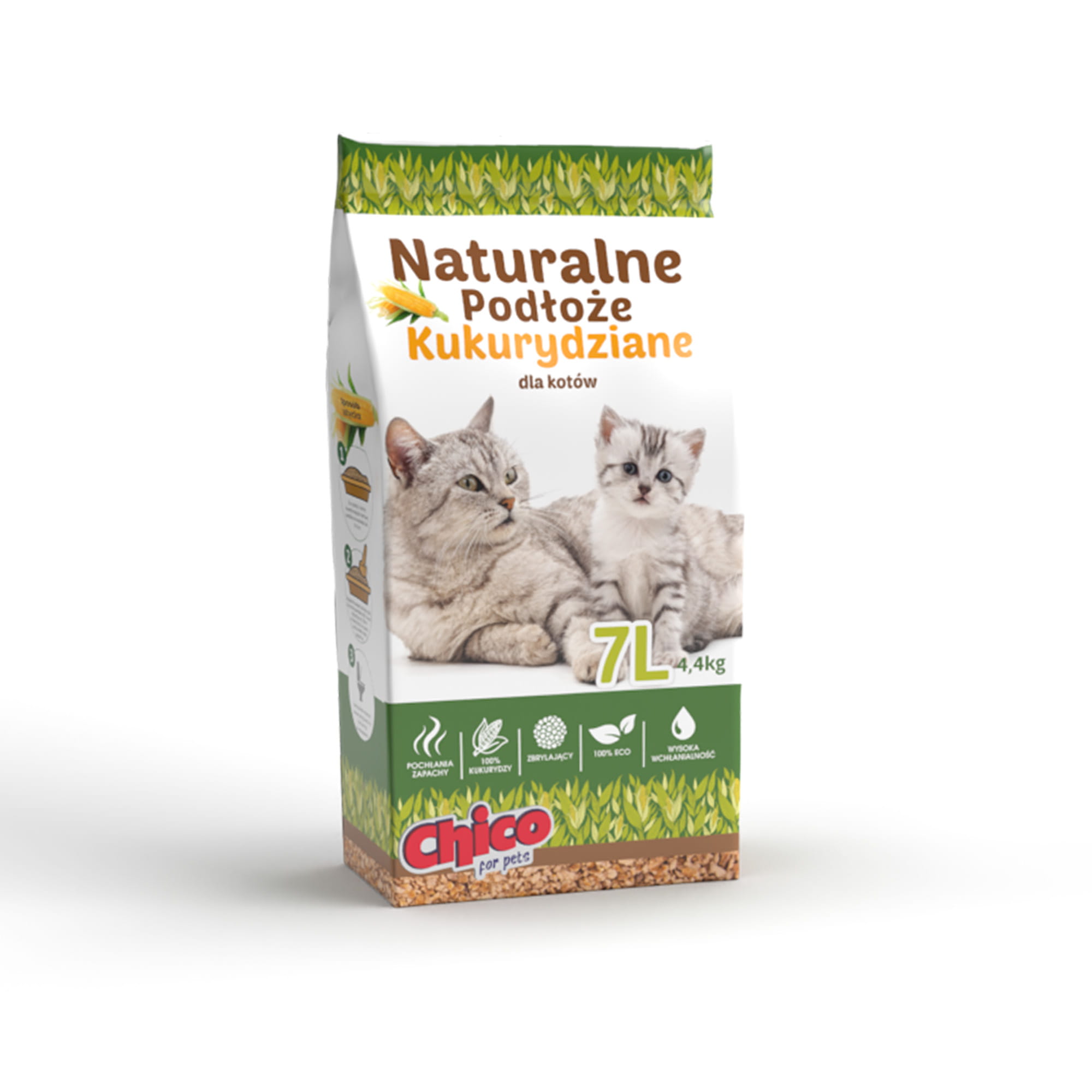 Chico podłoże kukurydziane, to naturalne podłoże dla kotów dorosłych i kociąt. Powstało w 100% z naturalnych materiałów pochodzenia roślinnego (kukurydzy), bez dodatków chemicznych. Produkt w formie kruszonu, który jest mocno zbrylający. Jest bardzo delikatny. Doskonale wchłania wilgoć i nieprzyjemne zapachy. Jest przyjazny dla środowiska, całkowicie biodegradowalny. W prosty sposób pozwala na utrzymanie czystości..