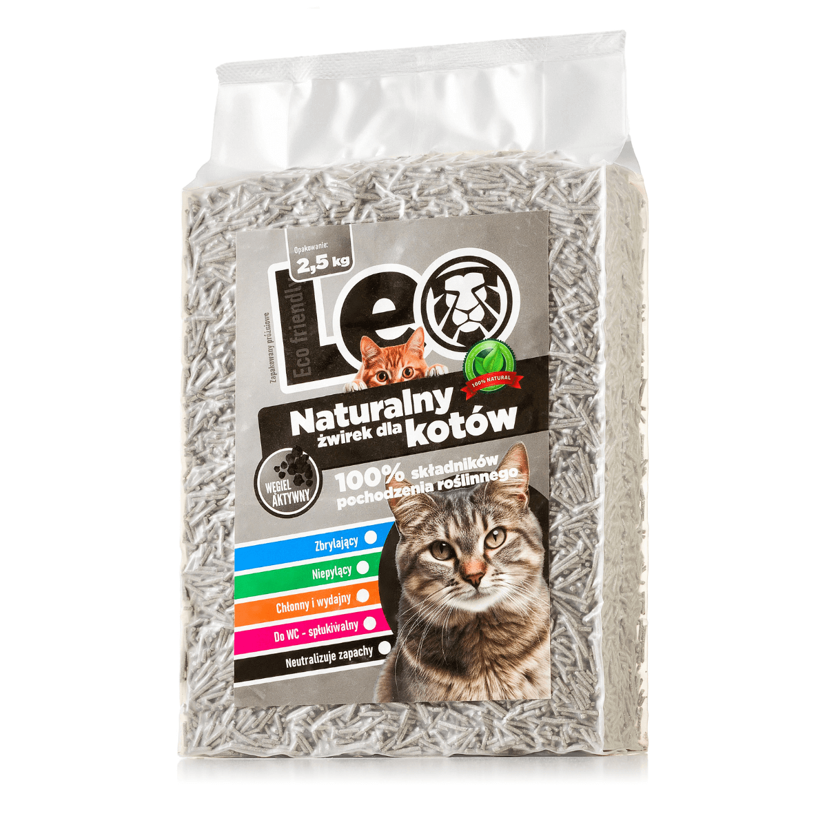 Żwirek Leo to 100% naturalny żwirek dla kotów, pozbawiony dodatków chemicznych. Został wykonany z pozostałości soi, włókien grochu i skrobi kukurydzianej, co czyni go w pełni biodegradowalnym i bezpiecznym dla środowiska. Skład pochodzenia roślinnego gwarantuje bezpieczeństwo użytkowania dla kota oraz właściciela.